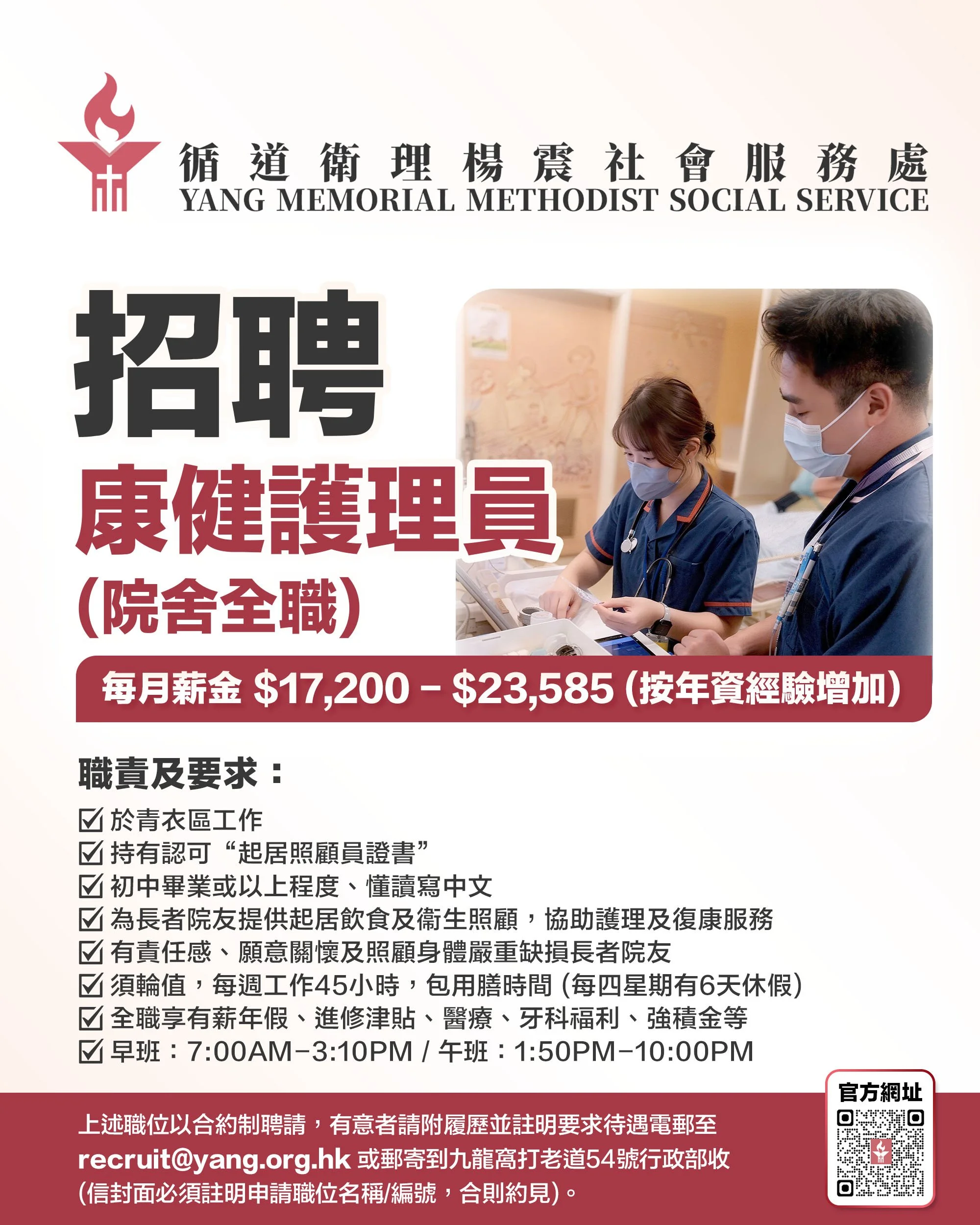 上述職位以合約制聘請,有意者請附履歷並註明要求待遇電郵至 recruit@yang.org.hk 或郵寄到九龍窩打老道54號行政部收 (信封面必須註明申請職位名稱/編號,合則約見)。